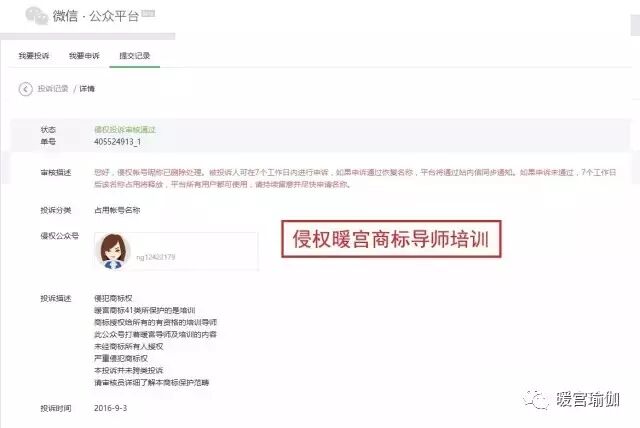 2016年9月后,广州暖宫瑜伽有限公司用商标权投诉了微信公众号:暖宫,并成功注册为自己的公众号